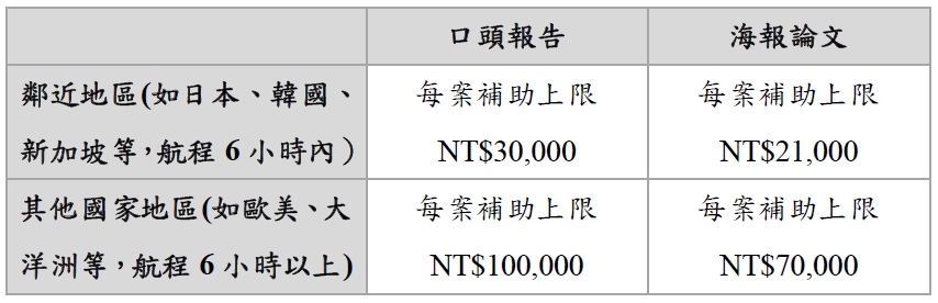 - 補助範圍包含往返機票費用(經濟艙)、生活費、旅遊保險費及會議註冊費等四項費用。
